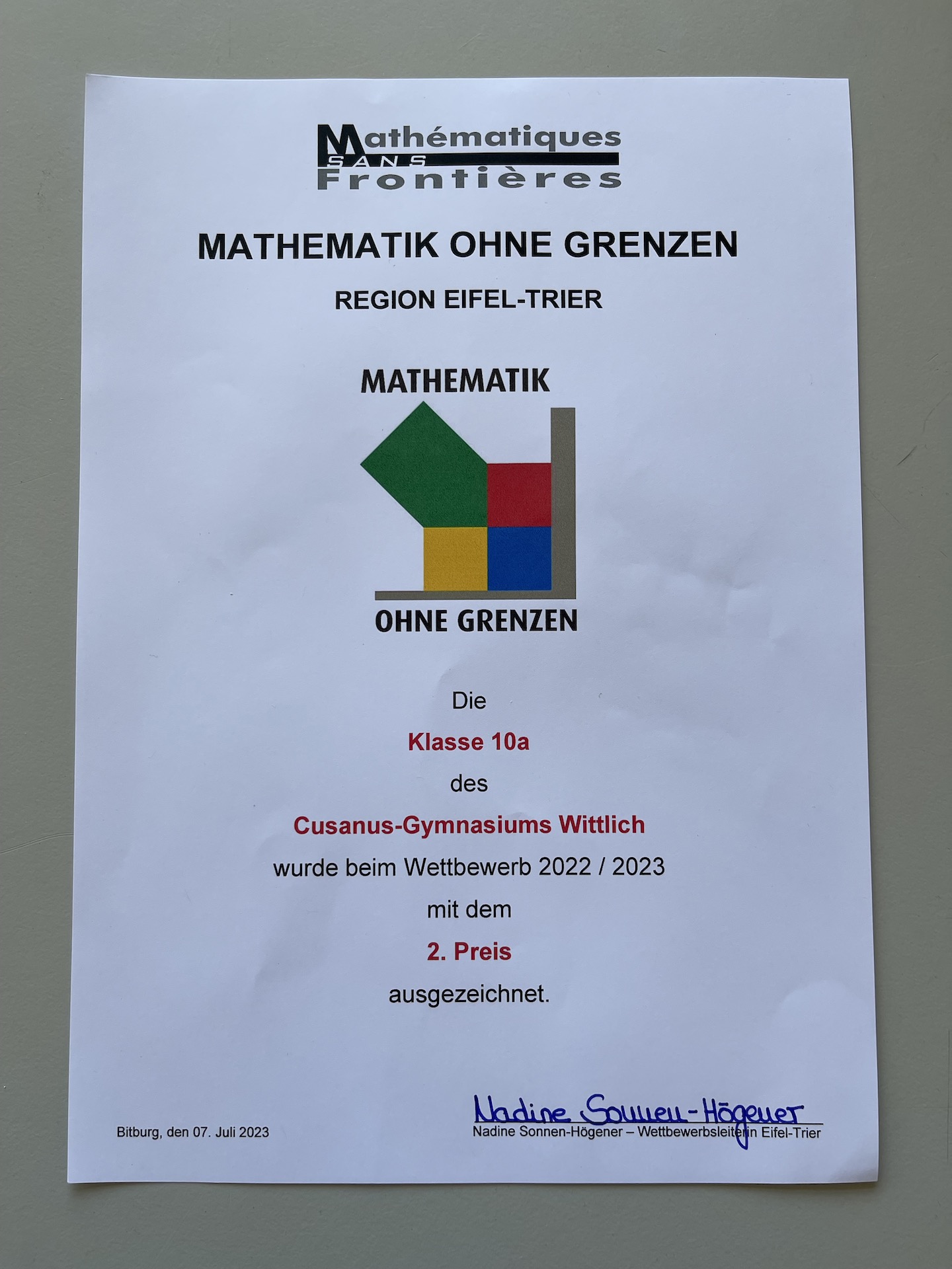 2. Platz beim internationalen Wettbewerb "Mathematik ohne Grenzen"