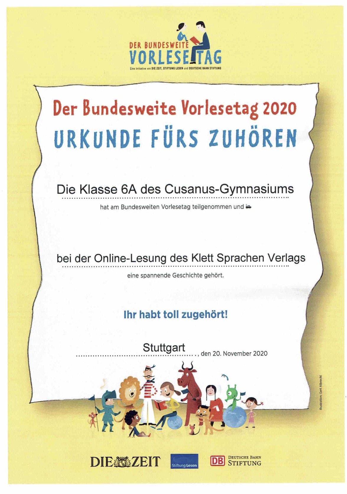 Beim Spendensammeln muss man erfinderisch sein, daher schauten sich die Schülerinnen und Schüler am bundesweiten Vorlesetag einen fremdsprachigen Beitrag des Klett Verlags an (Debbie Böhm las aus „The Magic Mirror“) und beantworteten die Preisfrage, in der Hoffnung, den Hauptgewinn von 100 Euro zu ergattern und diesen ebenfalls spenden zu können. Die Klasse kam unter die ersten 50 und konnte sich über 6 Buchstützen für den Klassenraum sowie eine Urkunde freuen, die 100 Euro gewann sie allerdings leider nicht.