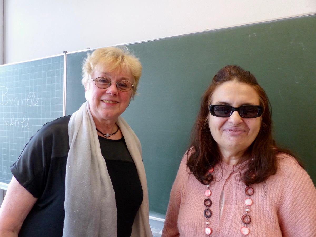 Frau Dr. Pilar Baumeister, von Geburt an blind und in Köln lebend, las Ausschnitte aus ihrer Novelle “Vor Elkes Geburt” vor, in der in Dialogform zwei Figuren abwiegen, unter welchen Bedingungen ein optimaler Lebensanfang gelingen könnte. Spielerische Schreibübungen, von Frau Baumeister initiiert, sollten die Schülerinnen und Schüler zudem dazu verlocken, erste eigene Schreibversuche zu wagen. Dass Frau Baumeister beim Vorlesen behende mit ihren Händen über die Braille-Buchstaben glitt, war beeindruckend und neu. Offen und herzlich sprach sie über die Herausforderungen, die ein Leben als blinde Schriftstellerin mit sich bringt; auch zeigte sie beispielhaft, wie sie eigene Texte in Braille-Schrift erstellt. Heute hilft natürlich auch der Computer beim Verfassen von Texten in Blindenschrift.