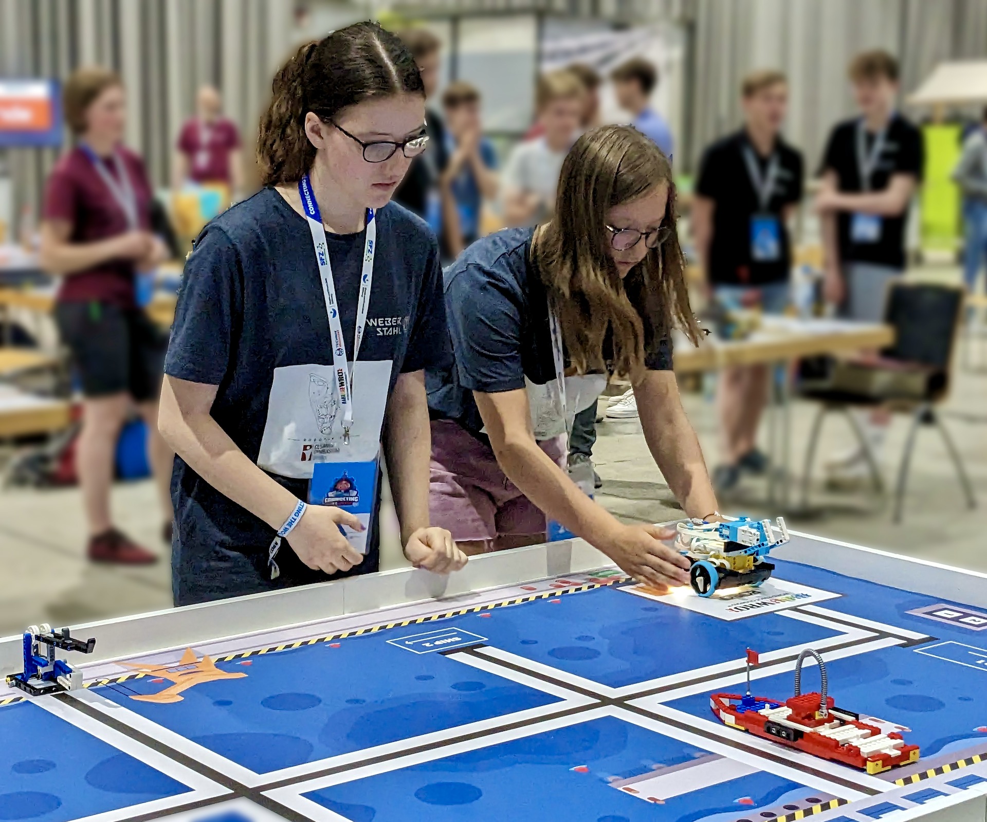 Als einziges nur mit Mädchen besetztes Team nahmen Mona Vollmer und Marie Vogt, beide aus der 9C, in der Kategorie “RoboMission Senior” vom 16. und 17. Juni 2023 erstmals in Freiburg am Deutschlandfinale der World Robot Olympiad (WRO), das diesjährig unter dem Motto „Connecting the World“ stand, teil und erzielten einen zwölften Platz. Insgesamt traten 122 Teams in vier verschiedenen Kategorien an, um die begehrte Startberechtigung für das Weltfinale der WRO in Panama zu erlangen.